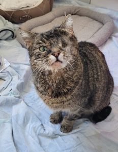 Unsere liebe Avil sucht ihr Zuhause. Eine kleine Persönlichkeit steckt in dieser tollen Katze. Vermutlich weil Avil auch schon so einiges in ihrem Leben durch hat. Zuerst einmal das Leben als Straßenkatze, welches sie ca. 3 Jahre geführt hat. Zwar mit fester Futterstelle, aber dennoch erst nach einigen Würfen (2024) kastriert, war es sicher nicht einfach für sie, ständig auf der Hut und in Sorge um ihre Kitten und ihr eigenes Wohl. Dann kam der Tag des Unfalls im Dezember 25…der alles verändert hat. Avil wurde von einem Auto erfasst und schwer verletzt am Unfallort zurück gelassen. Doch sie hatte „Glück“ , dass katzenliebe Menschen sie kurz darauf fanden und schnell in die Tierklinik nach Ludwigsburg brachten. Dort wurde Avil stabilisiert und die Schmerzen behandelt. Am folgenden Tag wurde sie in unsere Tierarztpraxis verlegt und gleich operiert. Avil hatte sich beim Unfall ein Schädel – Hirntraum und einen Kieferbruch zugezogen und verlor ihr linkes Auge. Dass sie bis dahin als Straßenkatze, ohne viel Menschenkontakt gelebt hatte, machte die Sache nicht unbedingt leichter. Trotz allem spürte man ihren Lebenswillen und ihren Kampfgeist. Nach 4 Tagen stationärer Behandlung zog Avil bei uns im Tierheim ein und hielt unsere Quarantänehelfer allesamt in Atem. Zum einen war sie ein etwas unleidiges, grimmiges Bündel Fell – was wir durchaus ihren Verletzungen zuschrieben. Zum anderen war auch nach der üblichen Heilungsphase nicht an eine normale Nahrungsaufnahme zu denken. Avil wollte nicht selbstständig fressen, was für unsere Helfer sehr viel Zeit, Mühe und Erfindungsreichtum erforderlich machte. Zwangsernährung war angesagt! Ein toller Plan mit einer „wilden“ Katze.