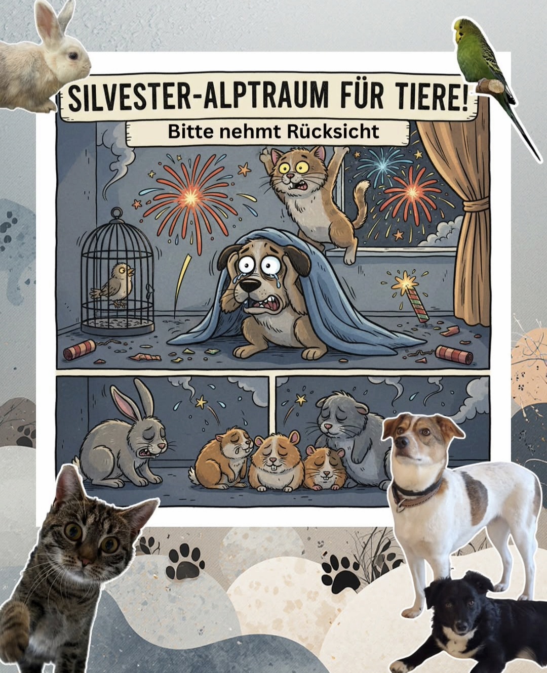 Für viele Menschen ist Silvester ein fröhlicher Jahresabschluss. Für die Tiere in unserem Tierheim bedeutet diese Nacht jedoch pure Angst. Das laute Knallen, Pfeifen und Explodieren versetzt sie in Panik. Sie zittern, verstecken sich, verletzen sich vor Stress oder sind noch Tage später völlig verstört.